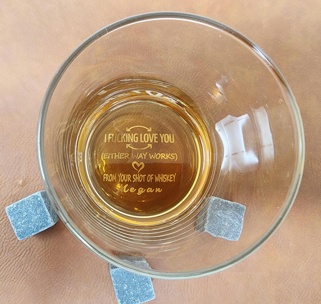 Custom laser engraved whiskey rocks glass the perfect gift for any man! Let him drink his favorite glass of whiskey! Etched in the USA!, each rocks glass measures 3 1/2" tall, with a 10 ounce capacity. All glasses come in a paper gift box. These are laser engraved and dishwasher safe! Optional Whiskey Stones and Wood Gift Box set.