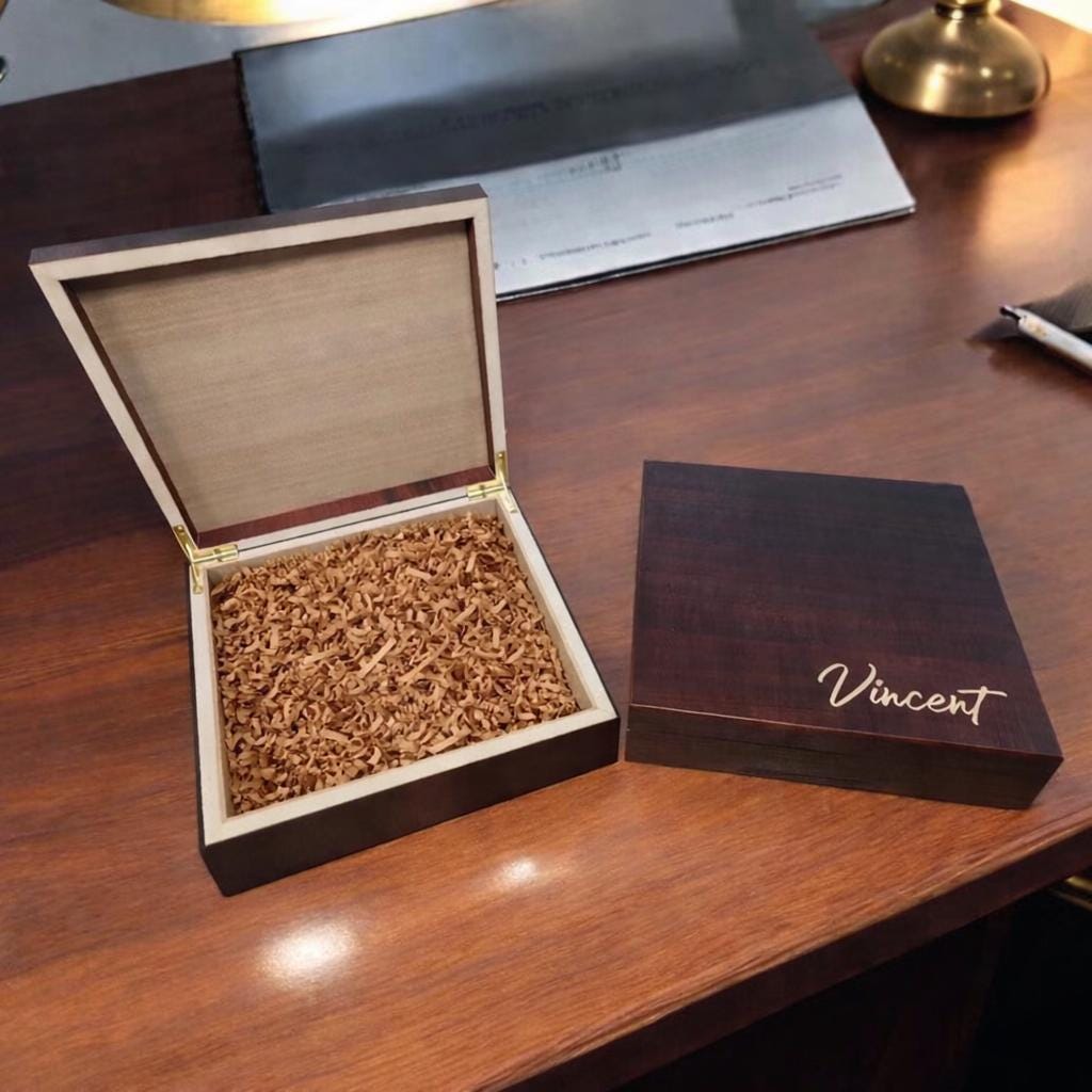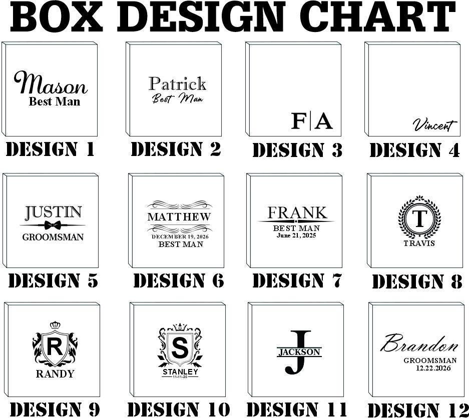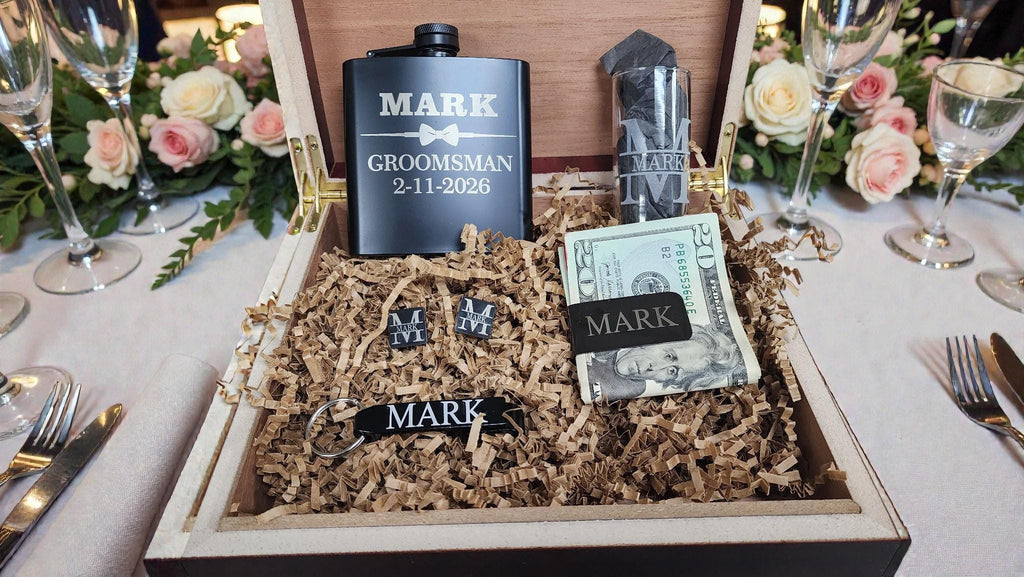 Each box is engraved with a name or monogram, role, and optional date, creating a meaningful keepsake your groomsmen will use long after the celebration is over.